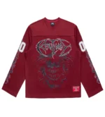 The Revenge Skull Flame Hockey Jersey Burgundy combines fiery skull graphics with a bold burgundy base and oversized streetwear fit.