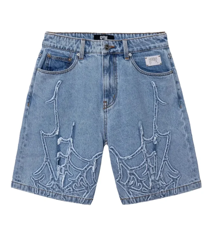 The Revenge Spider Web Embroidered Denim Shorts in Indigo feature bold embroidery and premium denim for a standout streetwear look.